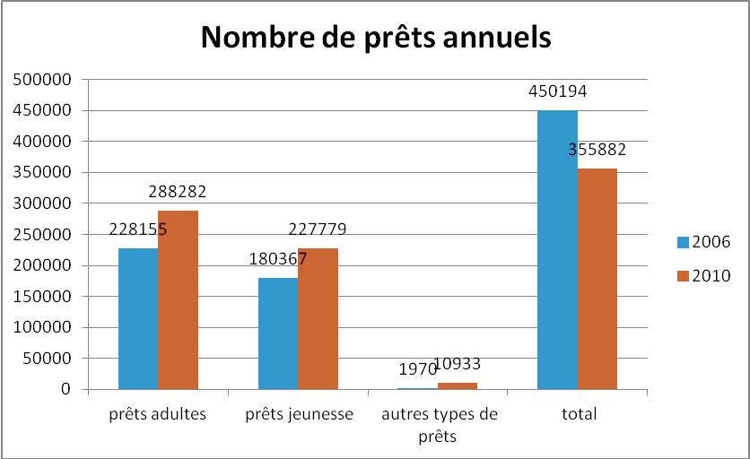 Note méthodologique: 8 bibliothèques n’ont pas répondu en 2010, et 4 bibliothèques ne nous ont fourni que le nombre total de prêts.