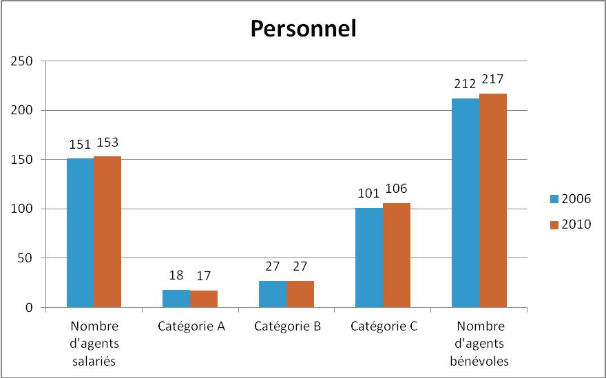 On peut constater que le nombre de professionnels est en constante évolution entre 2006 et 2010, plus particulièrement dans les cadres d’emploi de Catégorie C. Le nombre de bénévoles a lui aussi connu une légère augmentation entre 2006 et 2010.