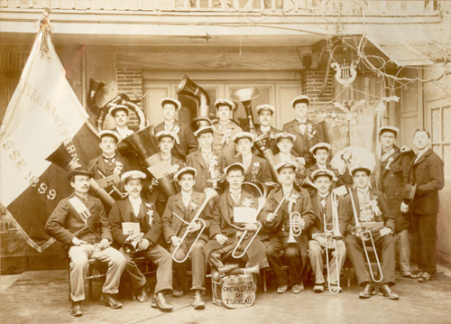 Les chevaliers du tonneau, conscrits des Ateliers des chemins de fer d'Epernay (Marne), 1899. Coll. part.